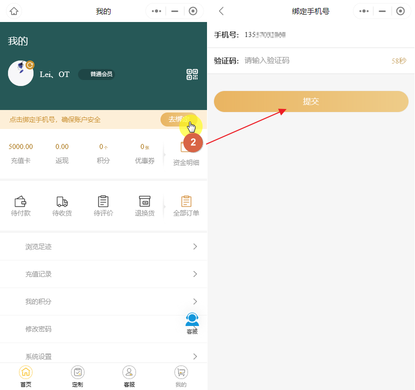 进入个人中心, 绑定手机号