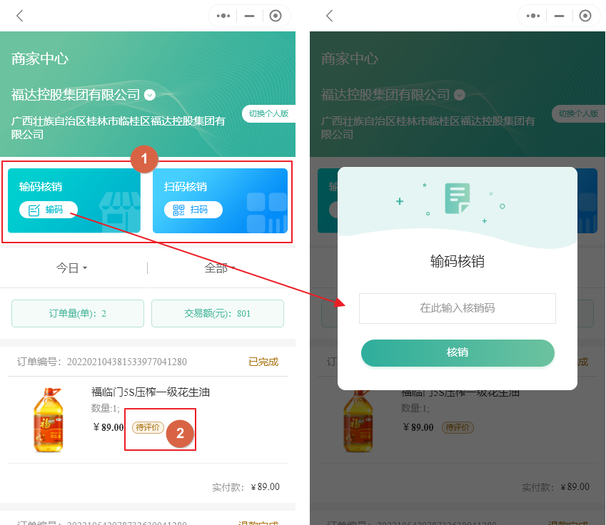 2. 核销完成后, 订单状态即刻变更, 如下图内②