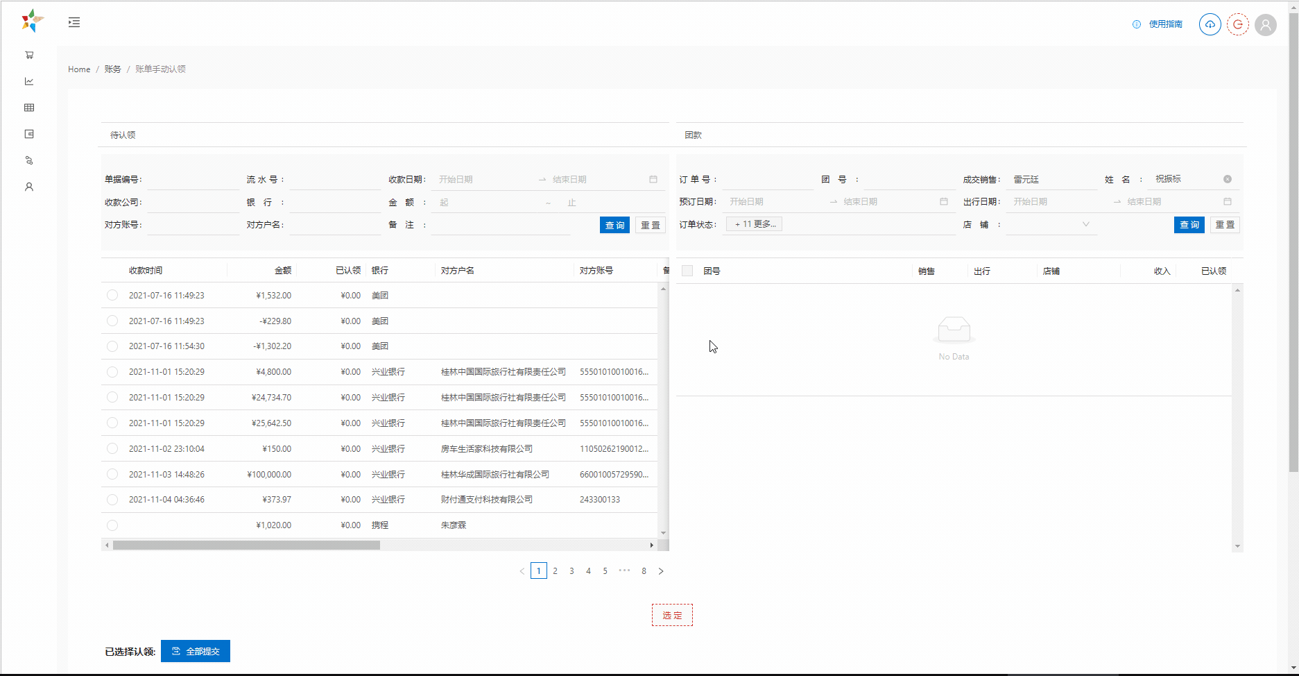 各种线下收款需要把银行账单的流水记录, 认领到订单中. 确认已收到团款. 账单由财务负责导入到系统中