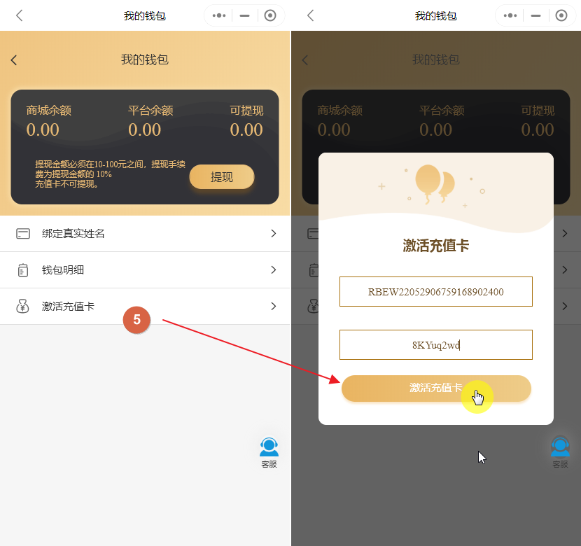 , 在弹出卡片上输入卡号和兑换码, 确认兑换 兑换成功之后, 即可看到充值卡余额
